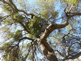 Aquí se aprecia la técnica de Enrique para recolectar el muérdago con un palo de un par de metros con unas tijeras de podar en la punta mientras yo iba como los monos por las ramas de este pino.